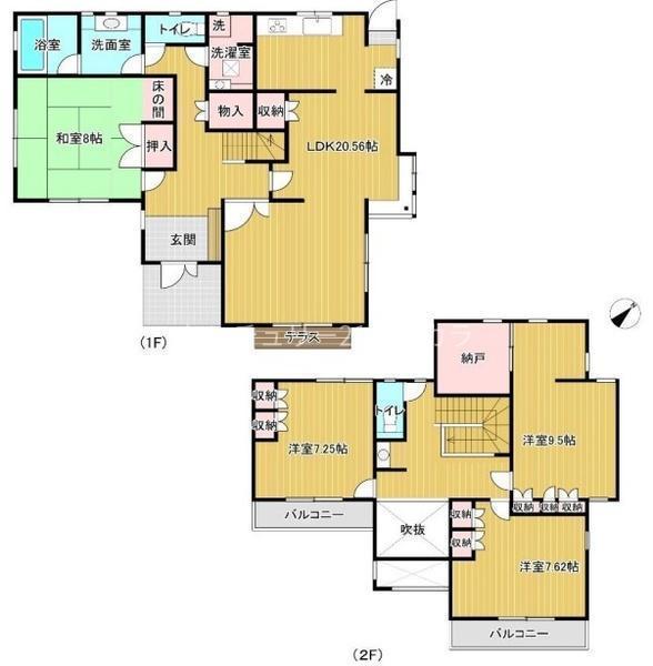 1F LDK 20.5帖 、1F 和 8.0帖 、2F 洋 9.5帖 、2F 洋 7.6帖 、2F 洋 7.2帖