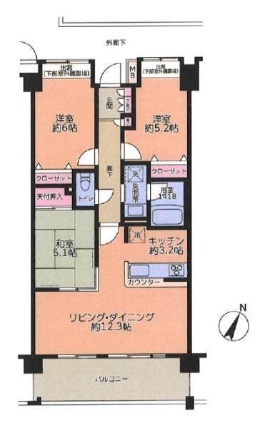 LDK 15.5帖 、洋 6.0帖 、洋 5.2帖 、和 5.1帖