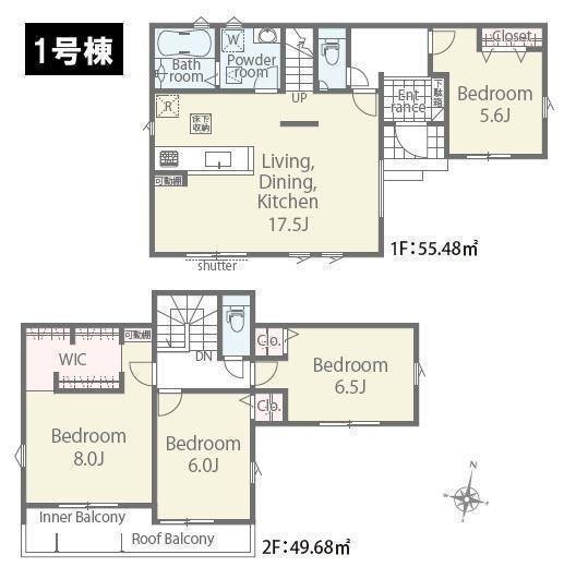 1F LDK 17.5帖 、1F 洋 5.6帖 、2F 洋 8.0帖 、2F 洋 6.5帖 、2F 洋 6.0帖