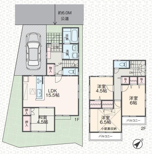 1F LDK 15.5帖 、1F 和 4.5帖 、2F 洋 6.5帖 、2F 洋 6.0帖 、2F 洋 4.5帖