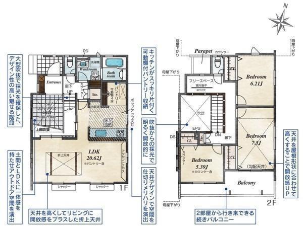 1F LDK 20.6帖 、2F 洋 7.5帖 、2F 洋 6.2帖 、2F 洋 5.3帖