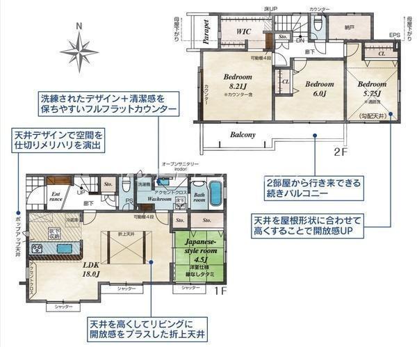 1F LDK 18.0帖 、1F 和 4.5帖 、2F 洋 8.2帖 、2F 洋 6.0帖 、2F 洋 5.7帖