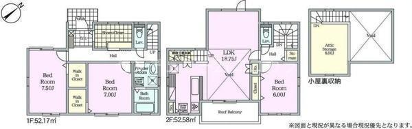 1F 洋 7.5帖 、1F 洋 7.0帖 、2F LDK 18.7帖 、2F 洋 6.0帖