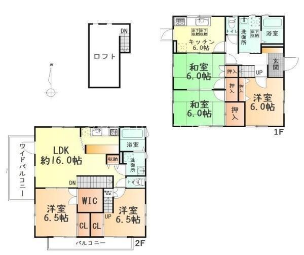 閑静な住宅地に建つ南向きの2階建。50坪超の敷地で日当り通風とも良好!キッチンやトイレなど水回りが各階に揃い、二世帯利用にも対応。和室やロフト、豊富な収納、ワイドバルコニーがそろう心地よい住まいです。