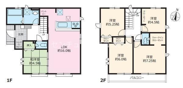 1F LDK 16.0帖 、1F 和 4.5帖 、2F 洋 7.2帖 、2F 洋 6.0帖 、2F 洋 5.2帖 、2F 洋 4.5帖