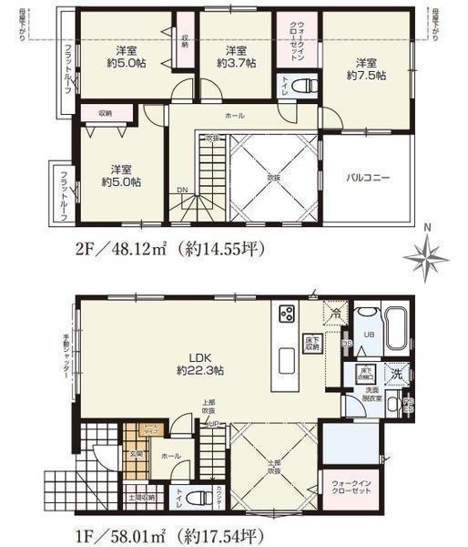 1F LDK 22.3帖 、2F 洋 7.5帖 、2F 洋 5.0帖 、2F 洋 5.0帖 、2F 洋 3.7帖