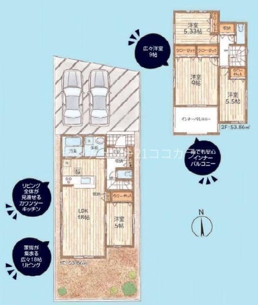 1F LDK 18.0帖 、1F 洋 5.0帖 、2F 洋 9.0帖 、2F 洋 5.5帖 、2F 洋 5.3帖