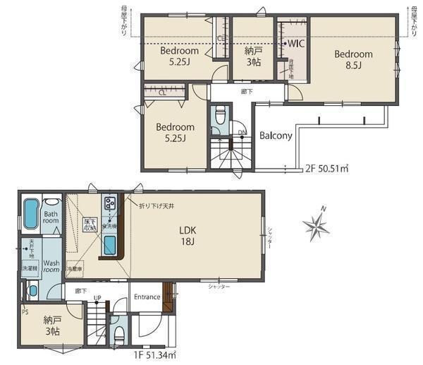 1F LDK 18.0帖 、1F S(納戸) 3.0帖 、2F 洋 8.5帖 、2F 洋 5.2帖 、2F 洋 5.2帖 、2F S(納戸) 3.0帖
