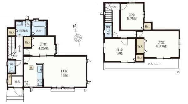 1F LDK 16.0帖 、1F 洋 4.2帖 、2F 洋 8.3帖 、2F 洋 6.0帖 、2F 洋 5.2帖