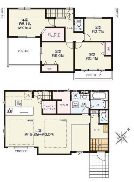 1F LDK 22.0帖 、2F 洋 8.1帖 、2F 洋 5.4帖 、2F 洋 5.0帖 、2F 洋 3.7帖