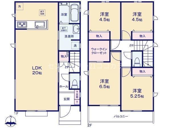1F LDK 20.0帖 、2F 洋 6.5帖 、2F 洋 5.2帖 、2F 洋 4.5帖 、2F 洋 4.5帖