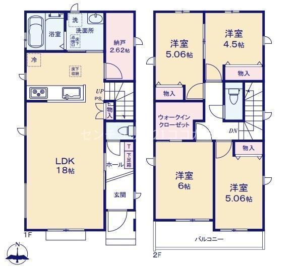 1F LDK 18.0帖 、1F S(納戸) 2.6帖 、2F 洋 6.0帖 、2F 洋 5.0帖 、2F 洋 5.0帖 、2F 洋 4.5帖