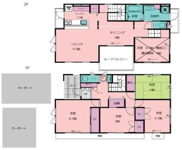 1F 洋 6.0帖 、1F 洋 6.5帖 、1F 洋 8.5帖 、1F 和 6.0帖 、2F LDK 21.0帖 、2F S(納戸) 6.5帖