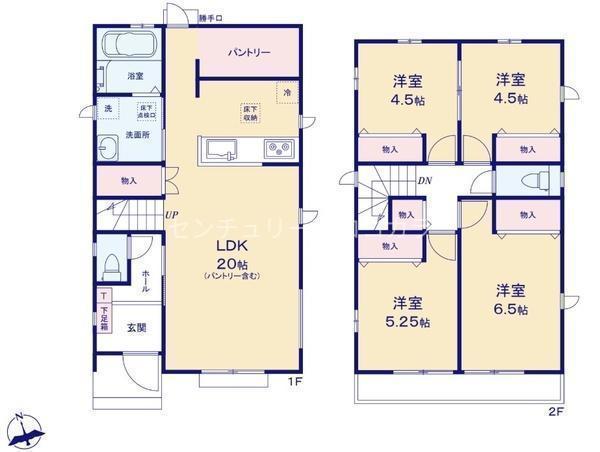 1F LDK 20.0帖 、2F 洋 6.5帖 、2F 洋 5.2帖 、2F 洋 4.5帖 、2F 洋 4.5帖