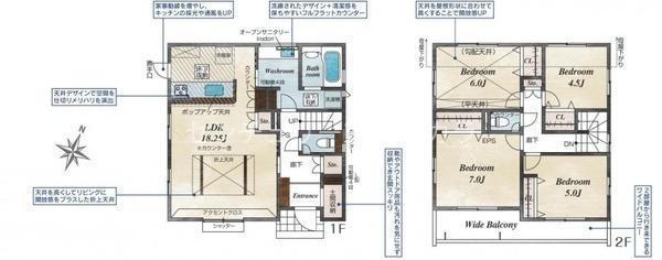 1F LDK 18.2帖 、2F 洋 7.0帖 、2F 洋 6.0帖 、2F 洋 5.0帖 、2F 洋 4.5帖