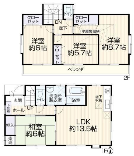 1F LDK 13.5帖 、1F 和 6.0帖 、2F 洋 8.7帖 、2F 洋 6.0帖 、2F 洋 5.7帖