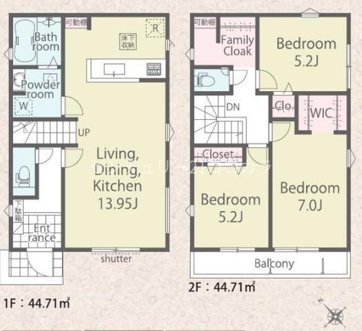 1F LDK 13.9帖 、2F 洋 7.0帖 、2F 洋 5.2帖 、2F 洋 5.2帖