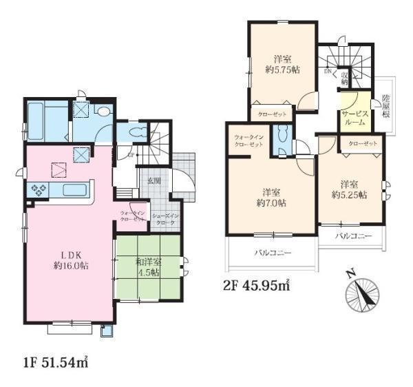 1F LDK 16.0帖 、1F 和 4.5帖 、2F 洋 7.0帖 、2F 洋 5.7帖 、2F 洋 5.2帖