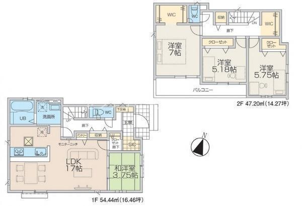 1F LDK 17.0帖 、1F 和 3.7帖 、2F 洋 7.0帖 、2F 洋 5.7帖 、2F 洋 5.1帖