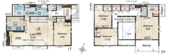 1F LDK 20.0帖 、1F 洋 6.0帖 、2F 洋 8.0帖 、2F 洋 5.2帖 、2F 洋 5.2帖