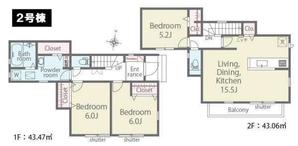 1F 洋 6.0帖 、1F 洋 6.0帖 、2F LDK 15.5帖 、2F 洋 5.2帖