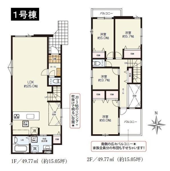 1F LDK 25.0帖 、2F 洋 6.0帖 、2F 洋 5.7帖 、2F 洋 5.0帖 、2F 洋 3.7帖